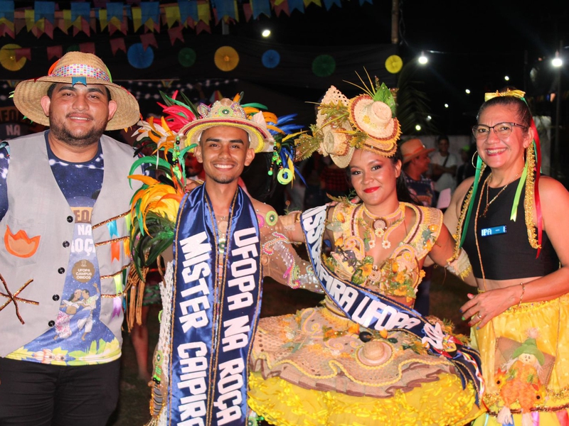 A Ufopa Campus Óbidos realizou no último sábado (08) o III Arraial Ufopa na roça que trouxe como tema “Eu juro que vi! Uma noite no Imaginário Amazônico’’. O evento contou com apresentações de danças de carimbó dos grupos: Swing de Carimbó, Forte Pauxis e Coração da Amazônia, além das apresentações realizadas pelos discentes do curso de pedagogia que foram: “O encanto do boto”, "perdidinhos na roça", “a dança do açaí”, “dança da Yara”, dança da “formiga cabeçuda”, “juro que vi na roça”, que fazem referência ao tema da festa. Além das danças, teve o I concurso para escolha de Miss e Mister, com a participação do júri para a escolha do casal caipira 2024, que os vencedores foram os discentes Kauê Ribeiro e Patrícia Kellenos representantes da turma de pedagogia 20222.